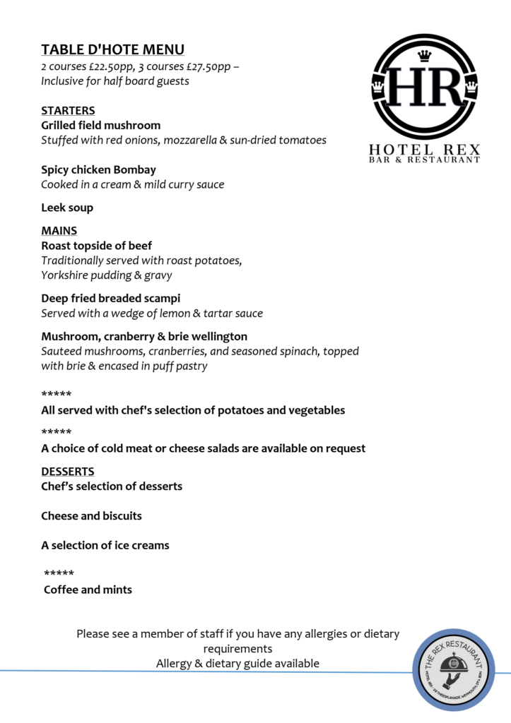 Table D'Hote menus change daily and are available to non-residents - served Sunday to Thursday from 6pm. See the menu below - Roast Beef served every Sunday! Excludes certain dates - contact us for more information. £22.50pp for 2 courses - £27.50pp for 3 courses